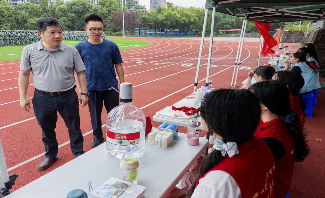 随后,徐达书记来到训练场“雷锋班” 志愿者服务点位,与志愿者们亲切交流。他仔细询问志愿者们的服务内容、轮班安排,察看饮用水补给、医疗应急物资储备等服务保障情况,对志愿者们主动放弃休息时间、坚守服务岗位的奉献精神给予充分肯定。他强调,“雷锋班” 志愿者在军训期间为教官与新生提供细致服务,用实际行动诠释了 “奉献、友爱、互助、进步” 的志愿精神,是雷锋精神在校园里的生动体现,不仅为军训工作的顺利开展提供了有力支持,更展现了文法学院学子的责任担当。