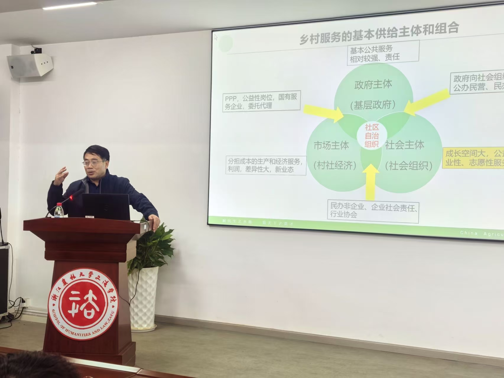 随后,左教授详细剖析了乡村服务的主要类型与具体内容,涵盖农业生产、市场环境、便民服务、人居环境等多个方面,并进一步探讨了乡村服务的生产逻辑与供给模式。