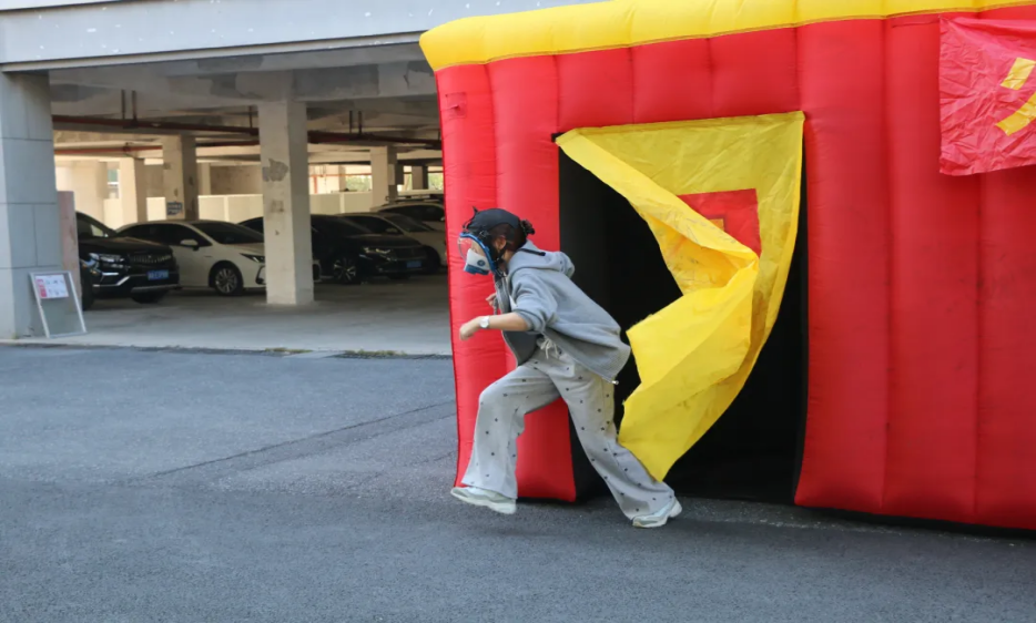 冲锋陷阵的比赛需要5名队员参加,每个人依次佩戴全面罩式防毒面具,之后进入类似迷宫的充气屋中,最后一名队员还要使用灭火器将燃着的火焰熄灭。当进入充气屋时,黑暗席卷而来,让人无法看清道路,只能依靠摸索前进,虽然同学们佩戴了面罩,依然有刺鼻的烟雾钻入鼻腔,让人感到恐惧,在身临其境的体验到火灾的感觉后,大家才更加理解火场逃生的困难,与消防员的不易。