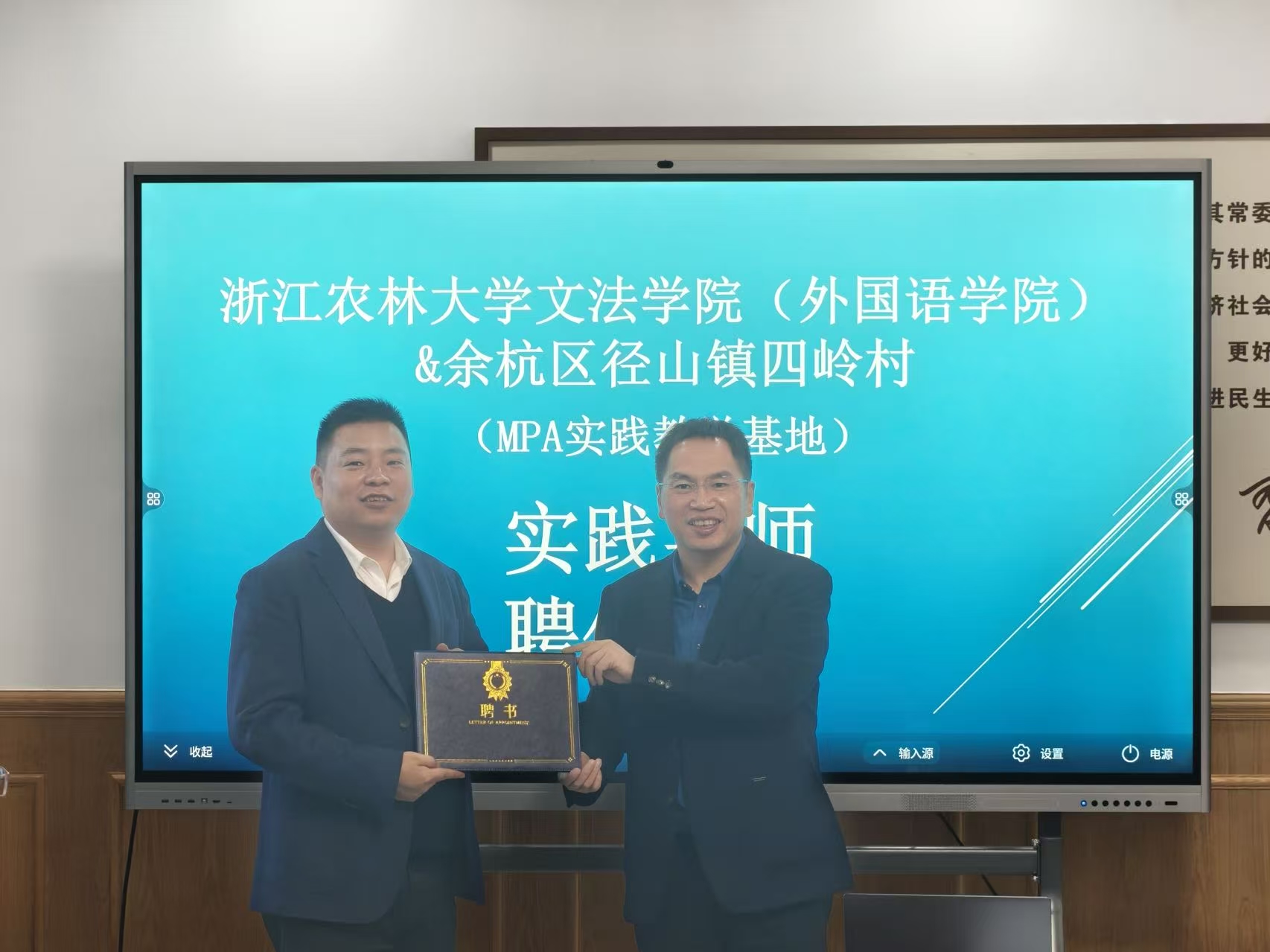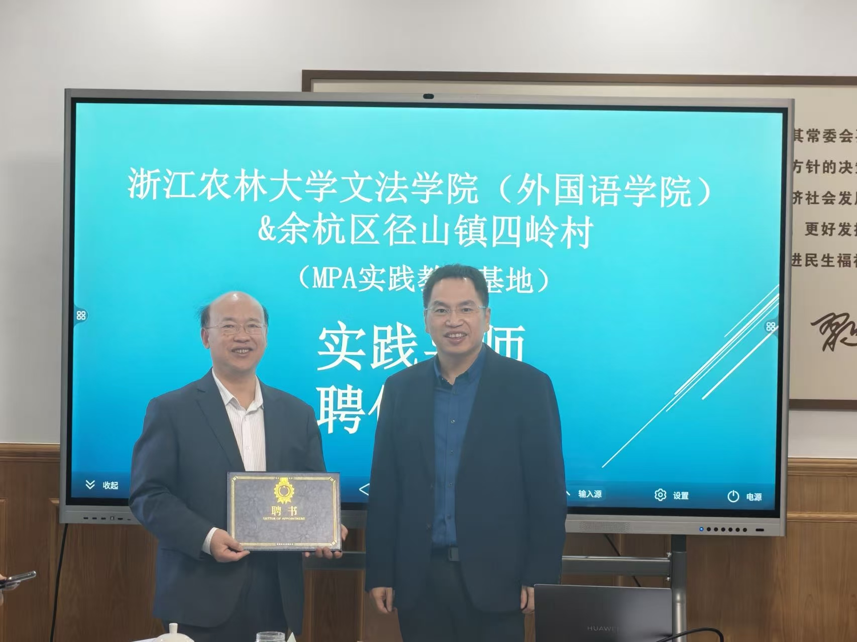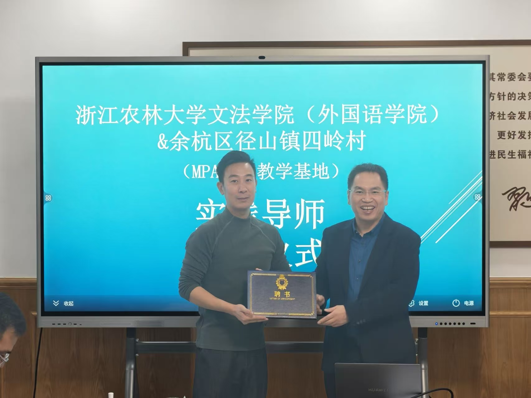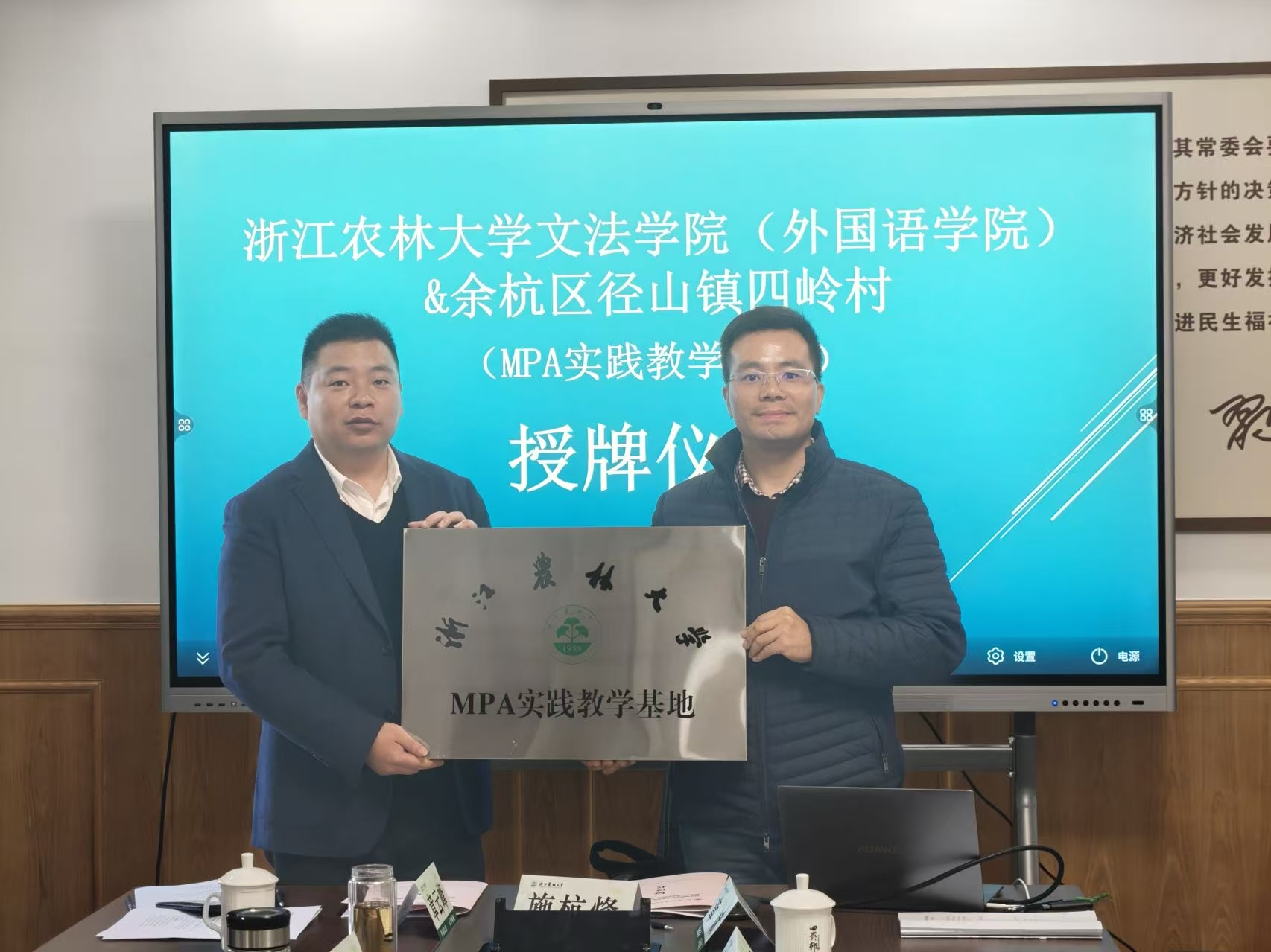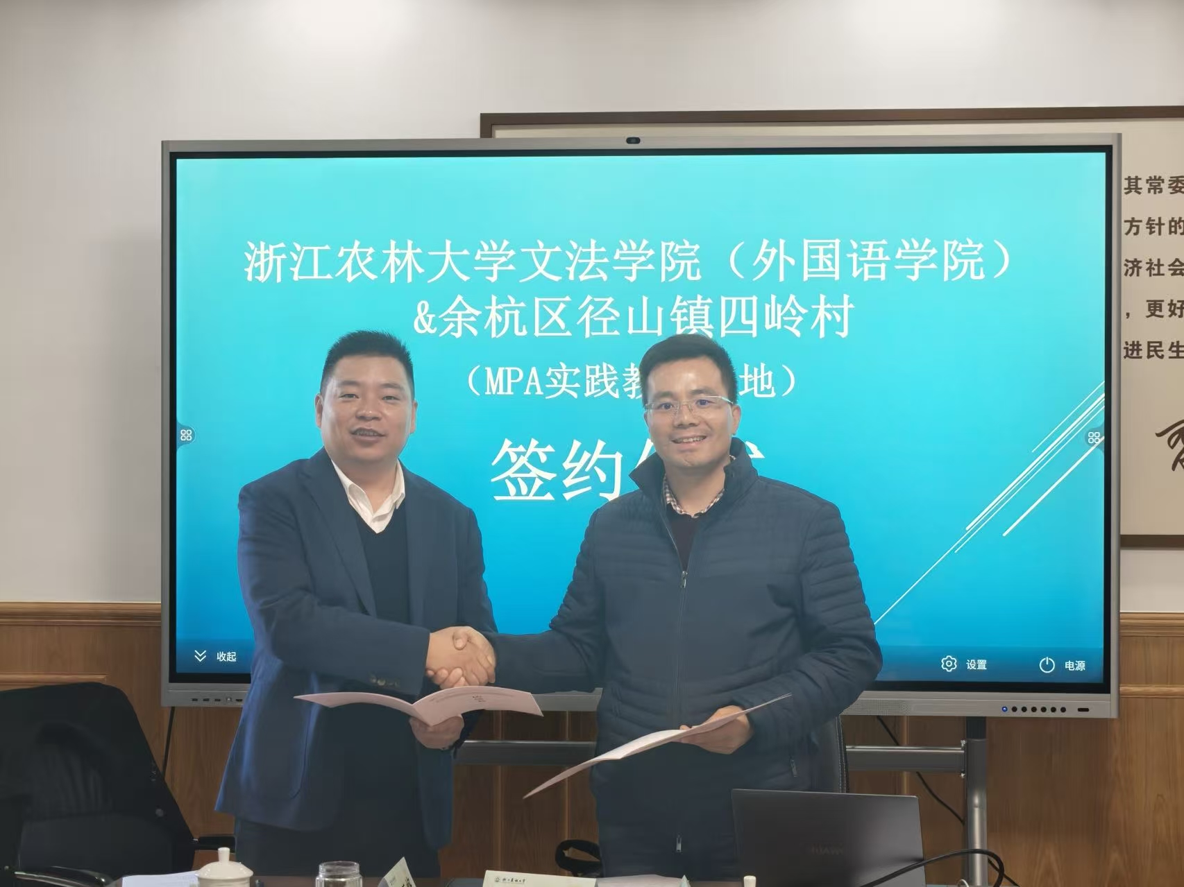 11月21日下午,文法学院与杭州市余杭区径山镇四岭村共建MPA实践基地签约授牌仪式在四岭村村委会三楼会议室顺利举行。仪式由MPA硕士点负责人李琳琳主持,文法学院学术副院长陈真亮、MPA导师季宗富,MPA硕士点助理李湘燕,与余杭区径山镇四岭村党委书记章云峰、农村职业经理人施杭烽等村委代表共同出席。浙江省农业农村现代化研究院副院长汲剑磊、建德市农业农村局副局长邹宗根等作为特邀嘉宾参与活动。双方签署共建实践基地协议,并完成实践基地授牌,正式确立合作关系。