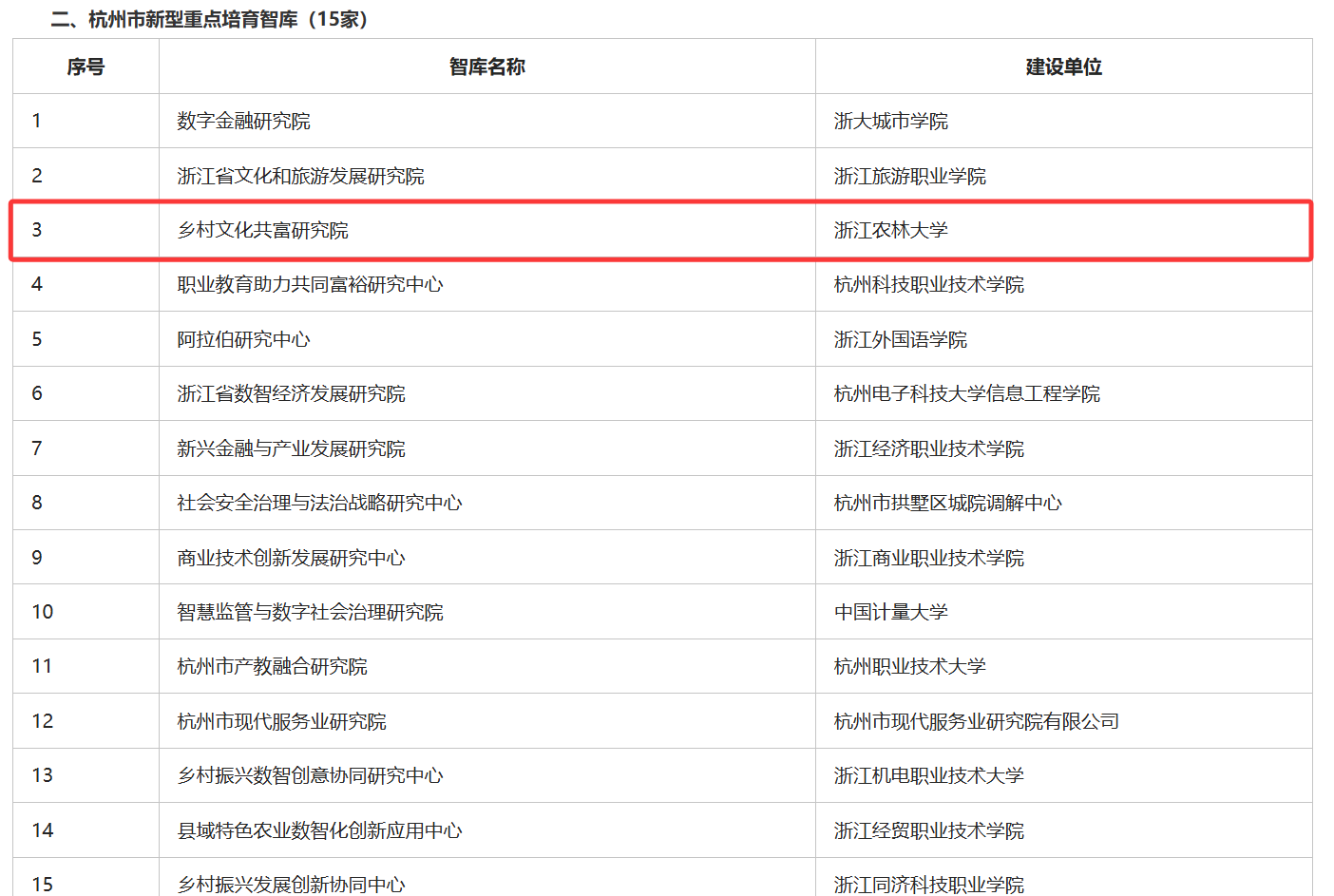 近日,杭州市哲学社会科学工作办公室正式公布了杭州市首批新型智库名单,浙江农林大学文法学院(外国语学院)牵头申报的“乡村文化共富研究院”成功入选。