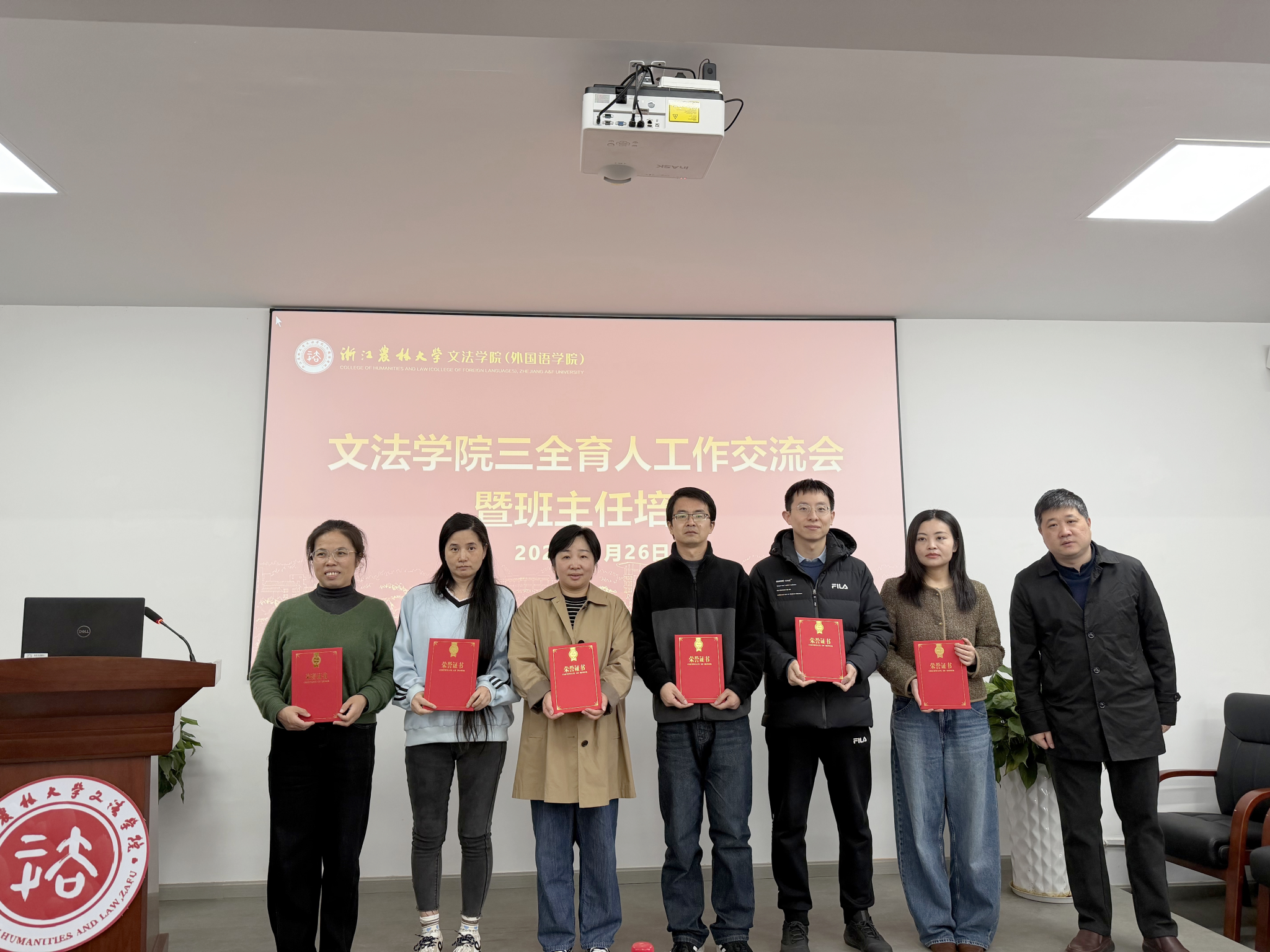 徐达为2025年度优秀班主任颁发荣誉证书,对在班级建设、学生发展指导等方面表现突出的班主任予以表彰,发挥先进典型的示范引领作用。徐达强调,班主任是落实“三全育人”的关键力量,肩负着思想引领、学业指导与成长护航的重要职责。他勉励全体班主任:一是提高政治站位,深刻理解新时代高校育人使命,切实扛起为党育人、为国育才的政治责任;二是强化责任担当,主动融入学生日常管理与成长服务,做学生成长成才的引路人;三是坚持协同联动,加强与任课教师、辅导员、学业导师之间的信息互通与资源整合,构建一体化育人格局。