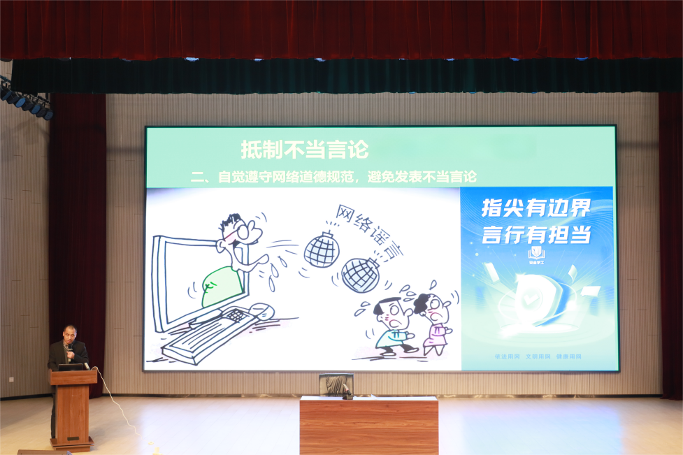法学专业教师刘辉开展专项法律法规教育宣讲,以刑法、宪法、教育法为核心,结合学生日常行为与校纪校规开展普法教育。刘辉老师围绕刑法典型案例,以案释法讲解网络造谣传谣、电信诈骗等行为的法律后果与责任追究,对照学校校纪校规,明确学生在校期间的行为规范与违纪处分,引导学生将法治意识内化于心、外化于行,做到知法、懂法、守法、用法,自觉以法律为准绳规范自身言行,做遵纪守法的新时代大学生。