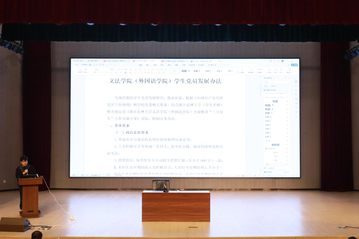 最后,为帮助学生明晰党员发展流程与标准,学生办主任、组织员黄君对新修订的《文法学院(外国语学院)学生党员发展办法》进行全面解读。学生办主任、组织员黄君从政治素质、学业表现、服务奉献三大基本要求入手,明确入党积极分子考察期限、志愿服务时长、成绩排名等硬性标准,同时说明学术创新、实践奉献等发展的重要性,以及政治立场、纪律底线等情形,为有入党意愿的学生指明努力方向,进一步推动学院党员发展工作规范化、标准化。