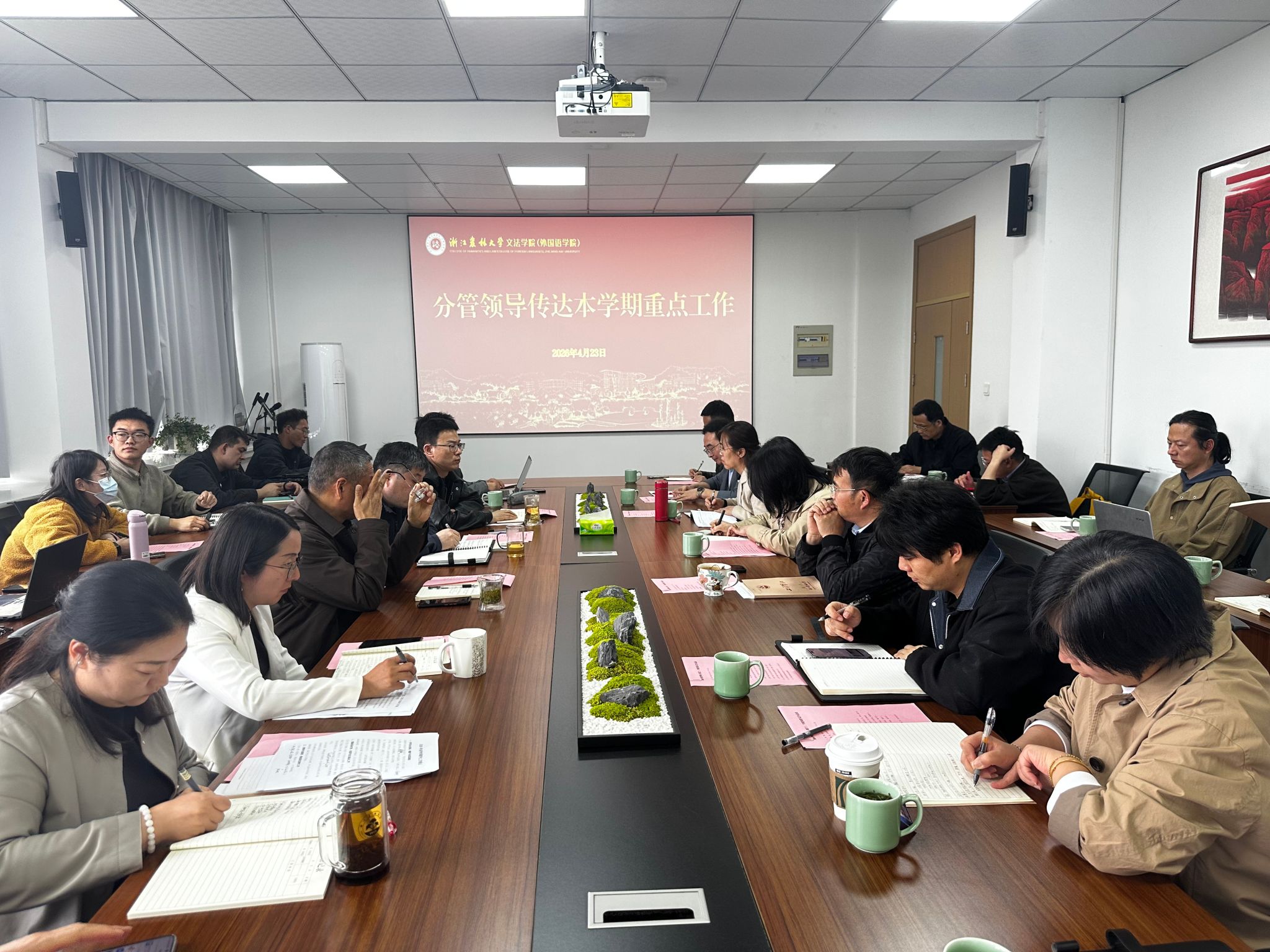 为进一步压紧压实工作责任,推动学院年度目标见行见效,4月23日下午,文法学院在实验楼612会议室召开学科部门负责人扩大会议。学院班子成员、学术副院长、学科部门负责人、专业负责人、教工党支部书记和副书记、学生党支部书记等近40人参加会议,会议由学院党委副书记(主持工作)徐达主持。