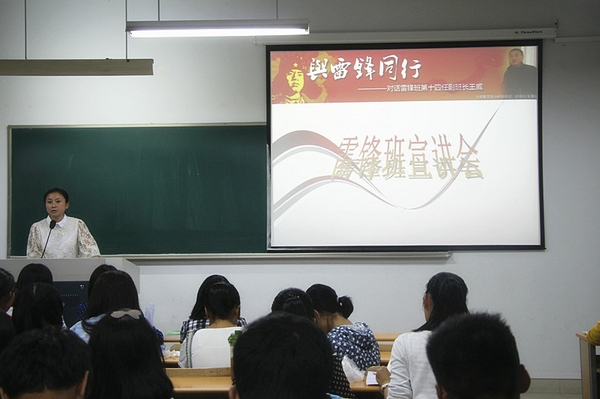 接着,在雷锋班宣讲会上介绍了我院特色品牌组织---雷锋班,并详细地介绍了班级的性质、成立背景、班级建制、班级公约及宗旨以及通过这个平台所践行雷锋精神的大量精彩活动。雷锋班成员身着红色T恤,在雨中迎接新生的亲切笑脸,在寝室文明建设中的积极表现,在续写雷锋日记中书写的一个个感人故事都深深地感染了在座的每个新生,唤起了他们内心的雷锋精神,激发了新生投身社会实践,践行雷锋精神的热情。